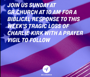 Curious to know more about this church, I then checked out GR.Church and found out that they were going to center the life of Charlie Kirk during their Sunday morning service. On the church’s Facebook page you can watch the service from Sunday morning, which as of 5pm on September 14th there were already 1,400 views. Twelve minutes into this video there is a video compilation celebrating Kirk, followed by the pastor’s sermon that also uses the life of Charlie Kirk as a model for what it means to be a Christian. GR.Church is located just south of 44th Street between Kalamazoo and Breton.