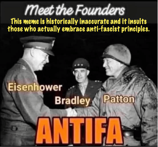 This brings us to the meme I want to deconstruct, especially since the meme refers to US military generals – Eisenhower, Bradley and Patton – as founding members of antifa. This claim is patently false. In Mark Bray’s book, ANTIFA: The Anti-Fascist Handbook, the author makes it clear that the first anti-fascists that were using such a designation were in various parts of Europe that were resisting the fascist government of Mussolini in the 1920s, and with German and other European groups resisting the Nazi Party. I would also recommend Jason Stanley’s How Fascism Works: The Politics of Us and Them, and Gord Hill’s, The Antifa Comic Book: 100 Years of Fascism and Antifa Movements.