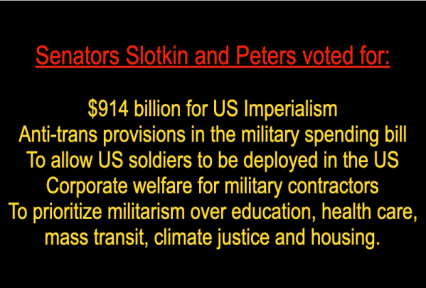 Michigan Senators Slotkin and Peters vote for Trump’s $914 billion military bill, with anti-trans provisions and allowing US troops to be deployed in the US