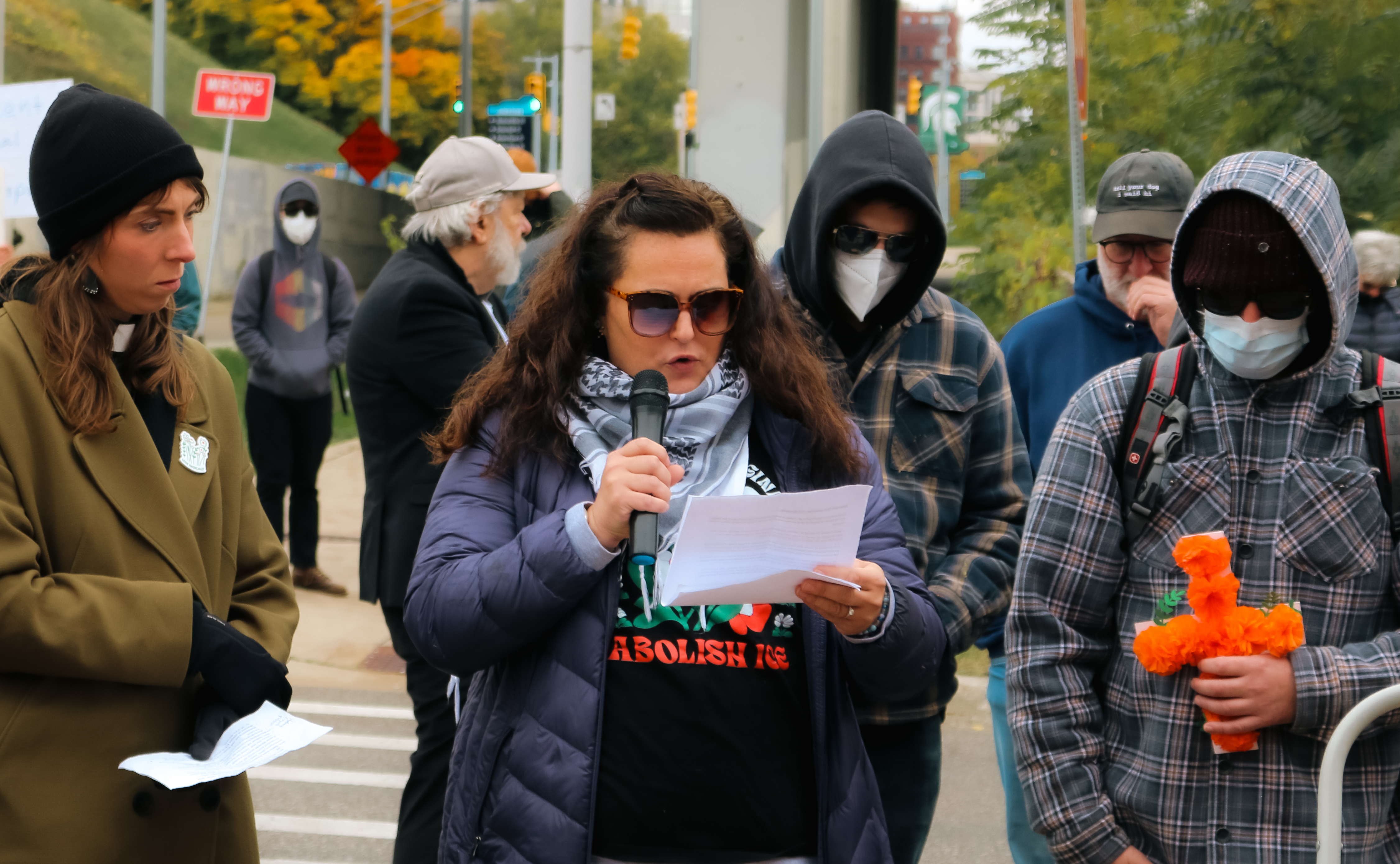 After acknowledging those who have died in ICE Detention Centers a representative from No Detention Centers in Michigan played audio from someone who had recently been released from the North Lake ICE Detention Center in Baldwin, Michigan, followed by a second audio recording of someone who is still locked up there. Lauren Ann Coman then read in English what both men had said in Spanish.