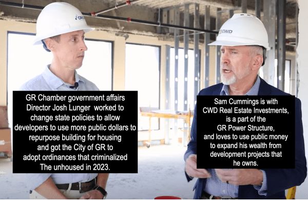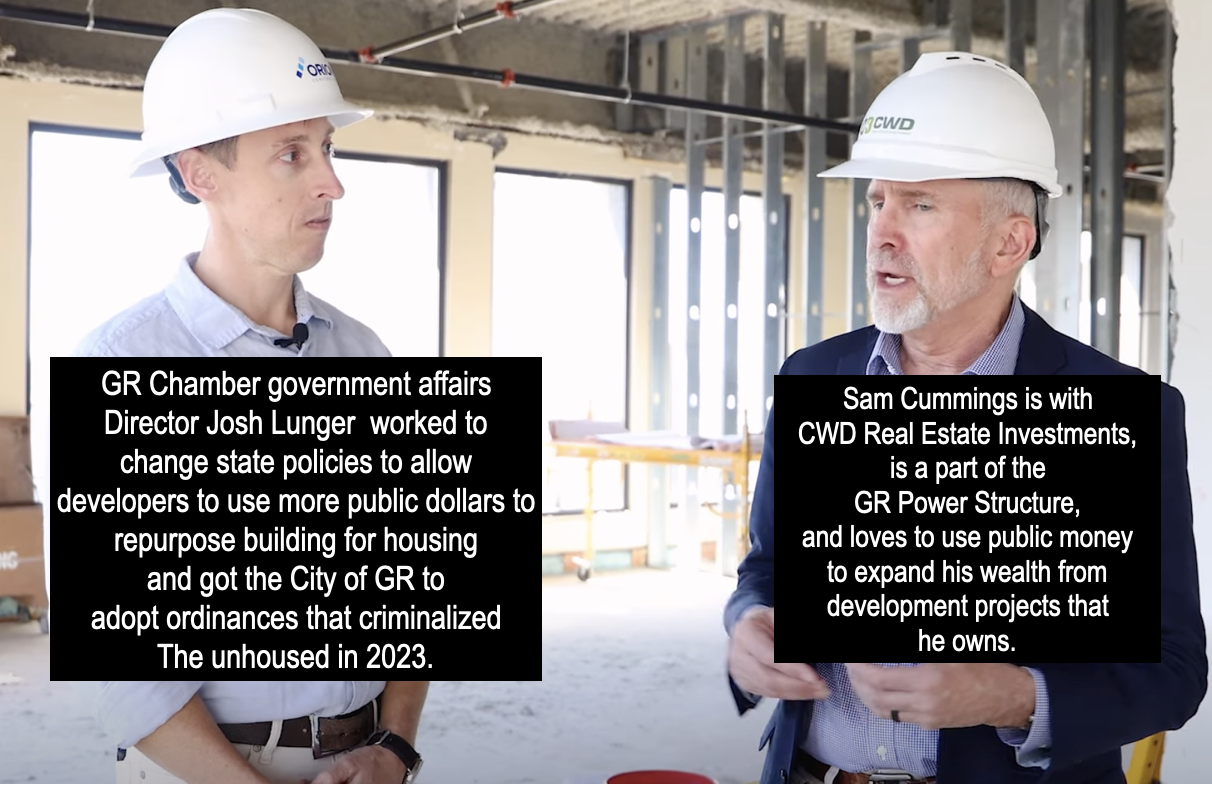 The irony of having Lunger and Cummings featured in this video is that Cummings has been a part of the Grand Rapids Power Structure for decades and Lunger was instrumental in lobbying state legislators to change a law that will allow developers to use public dollars when converting former office space into housing.