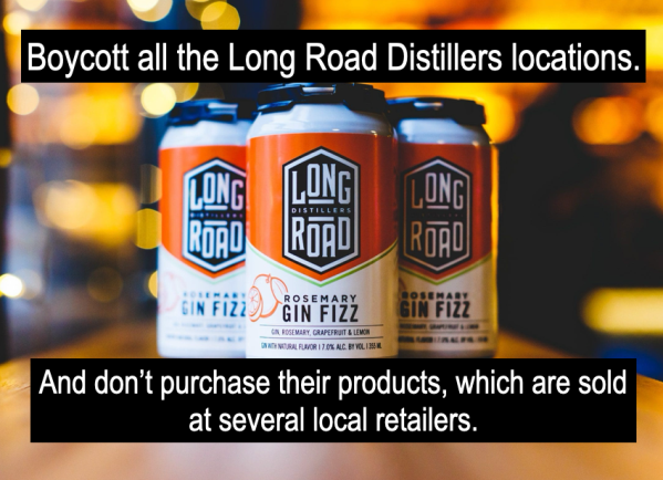 The boycott on Saturday targeted the Less Traveled bar, which is part of Long Road Distillers, but branded differently in a different part of the city. People who showed up for the boycott campaign on Saturday handed out flyers to people walking along Cherry Street and those that were coming out of or going into one of Mayor LaGrand’s bars. Other people held signs and most people participated in the chants that were led by members of Movimiento Cosecha.