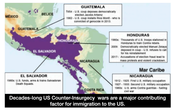 In addition, I presented a brief historical overview of US military and economic policies towards Central America from the mid-19th century til today. I talked about how the US sent the Marines to invade those countries, plus the history of US funded and military training for the counterinsurgency wars in the 1970s and 80s, followed by the Central American Free Trade Agreement, also known as CAFTA.