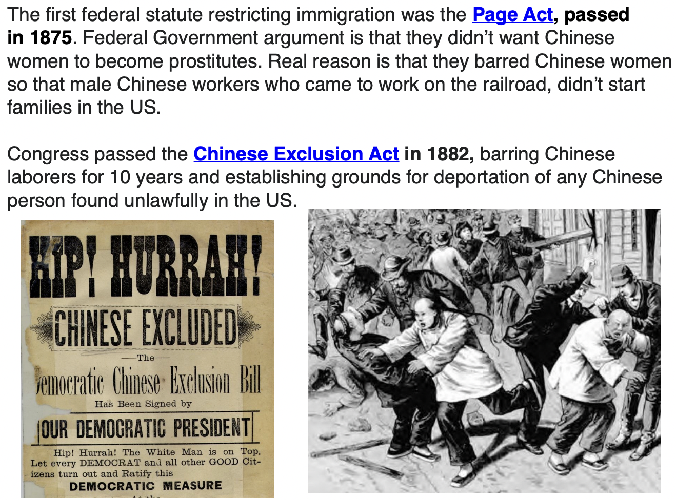 However, most of the presentation looked at actual US immigration policies from the founding of the US, such as the Chinese Exclusion Act, which not only demonized Chinese people, but limited how many Chinese people could be in the United States.
