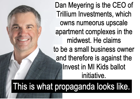 If Meyering can spend that kind of money to influence local elections and sit on state boards that approve millions of public dollars for private projects, he can surely pay a modest increase in income taxes to benefit public education. This is what propaganda looks like and why we need to call it out.
