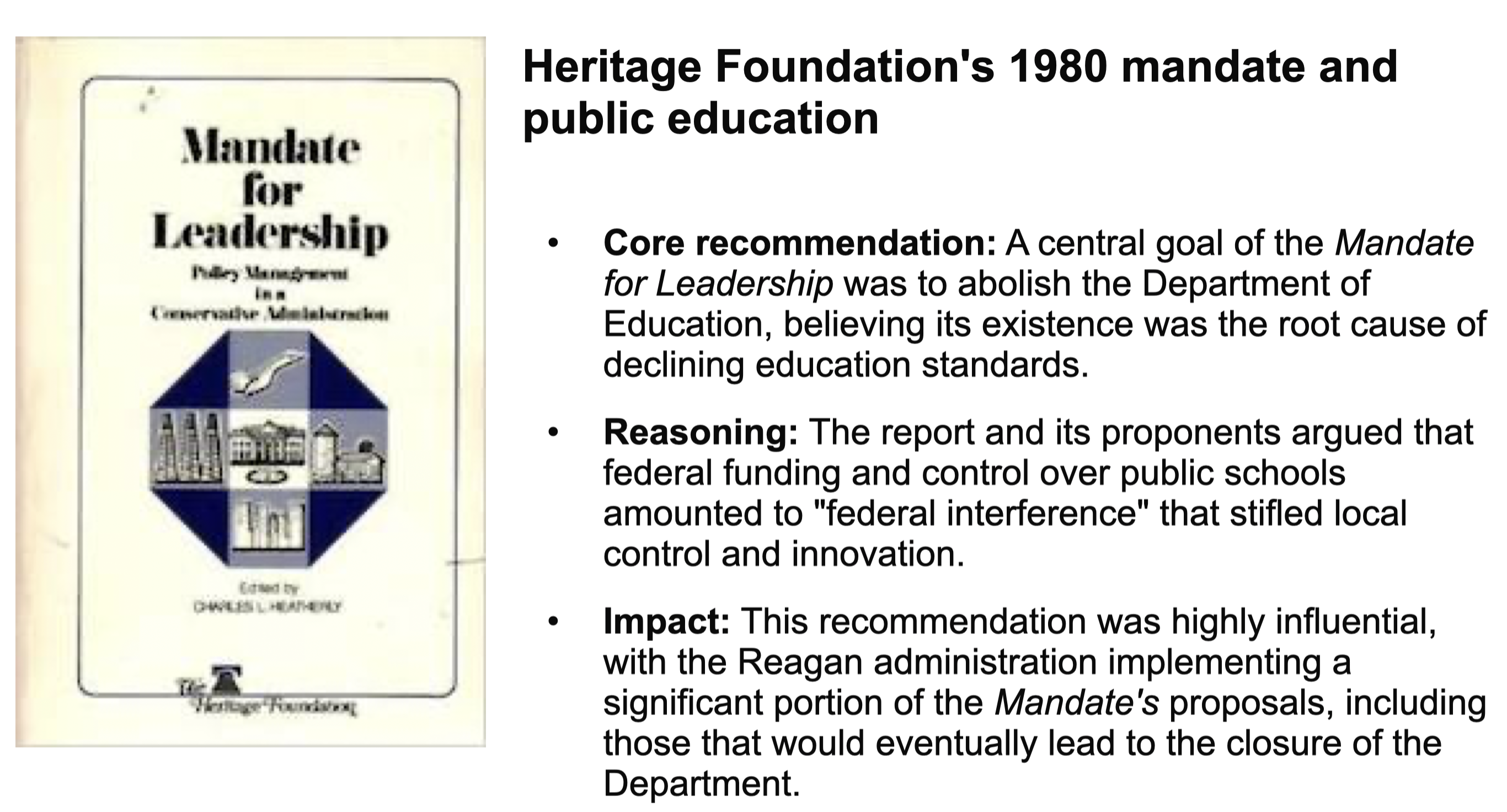 I presented several slides, beginning with the one here above, which focused on the Heritage Foundation’s Mandate for Leadership document, which was fundamentally adopted by the Reagan Administration, especially concerning public education.