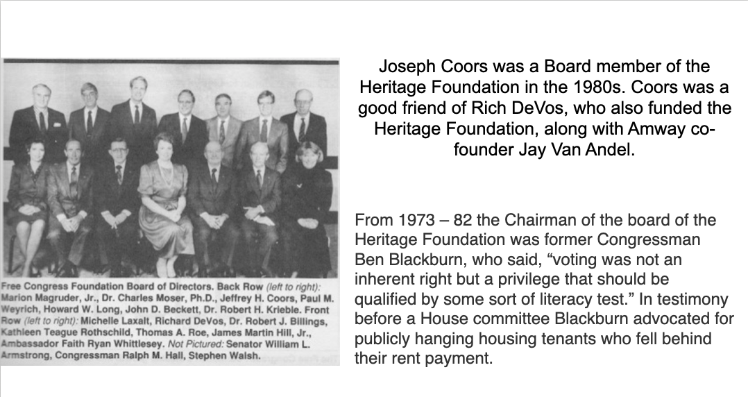 A second slide shows some of the members of the Free Congress Foundation, specifically Joseph Coors and Rich DeVos, both of which provided millions of dollars to the Heritage Foundation beginning in the mid-1970s.