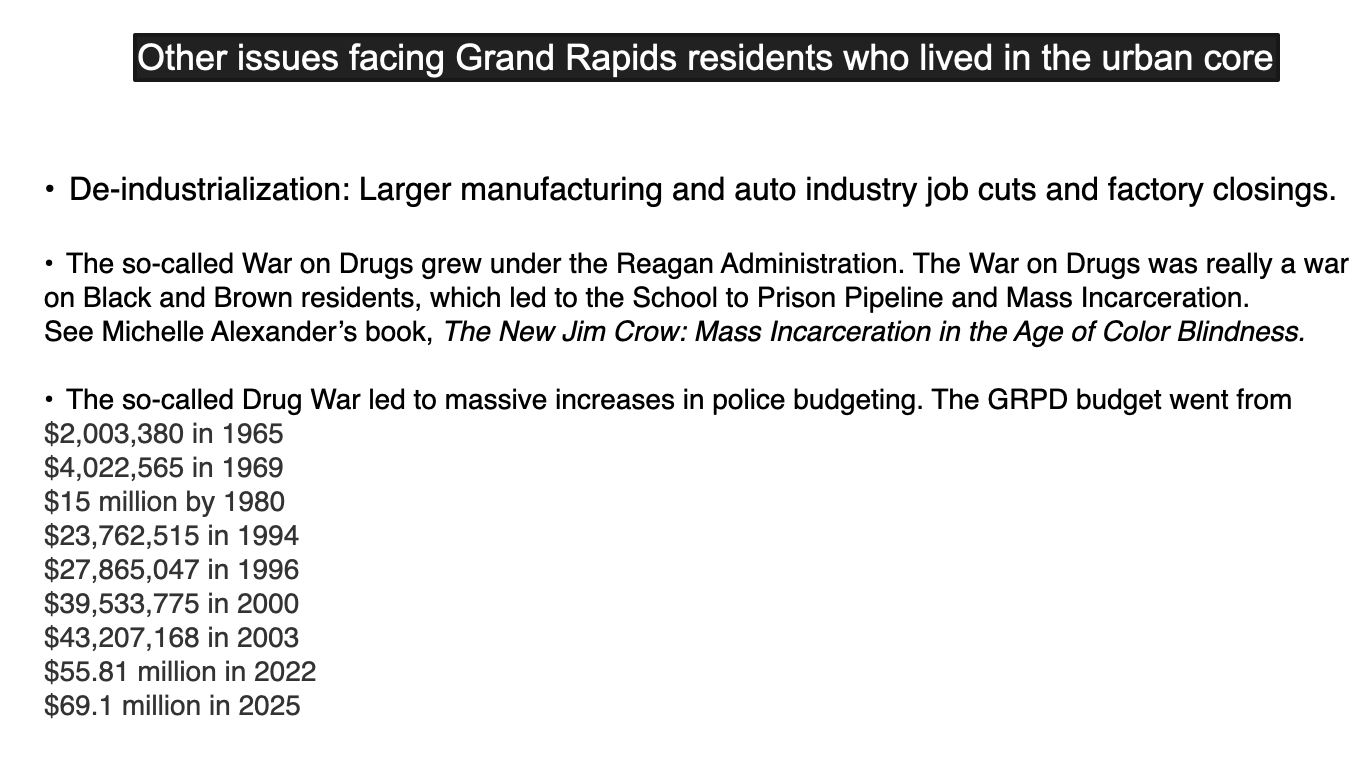 In the 3rd slide you can see economic factors that impacted families in Grand Rapids, the loss of good paying jobs for working class people, the advent of an accelerated Drug War in Grand Rapids and how the GRPD budget exponentially grew over time.