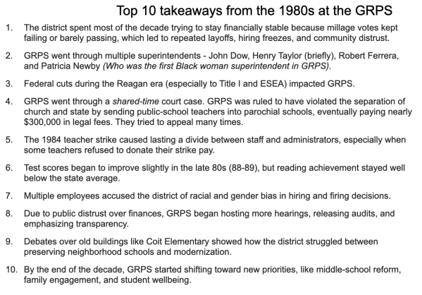 The fourth slide involved content created by a graduate student who has been looking at GR Press coverage and other source documents on the GRPS from the 1980s. Here is the summary of the top ten issues they came away with.