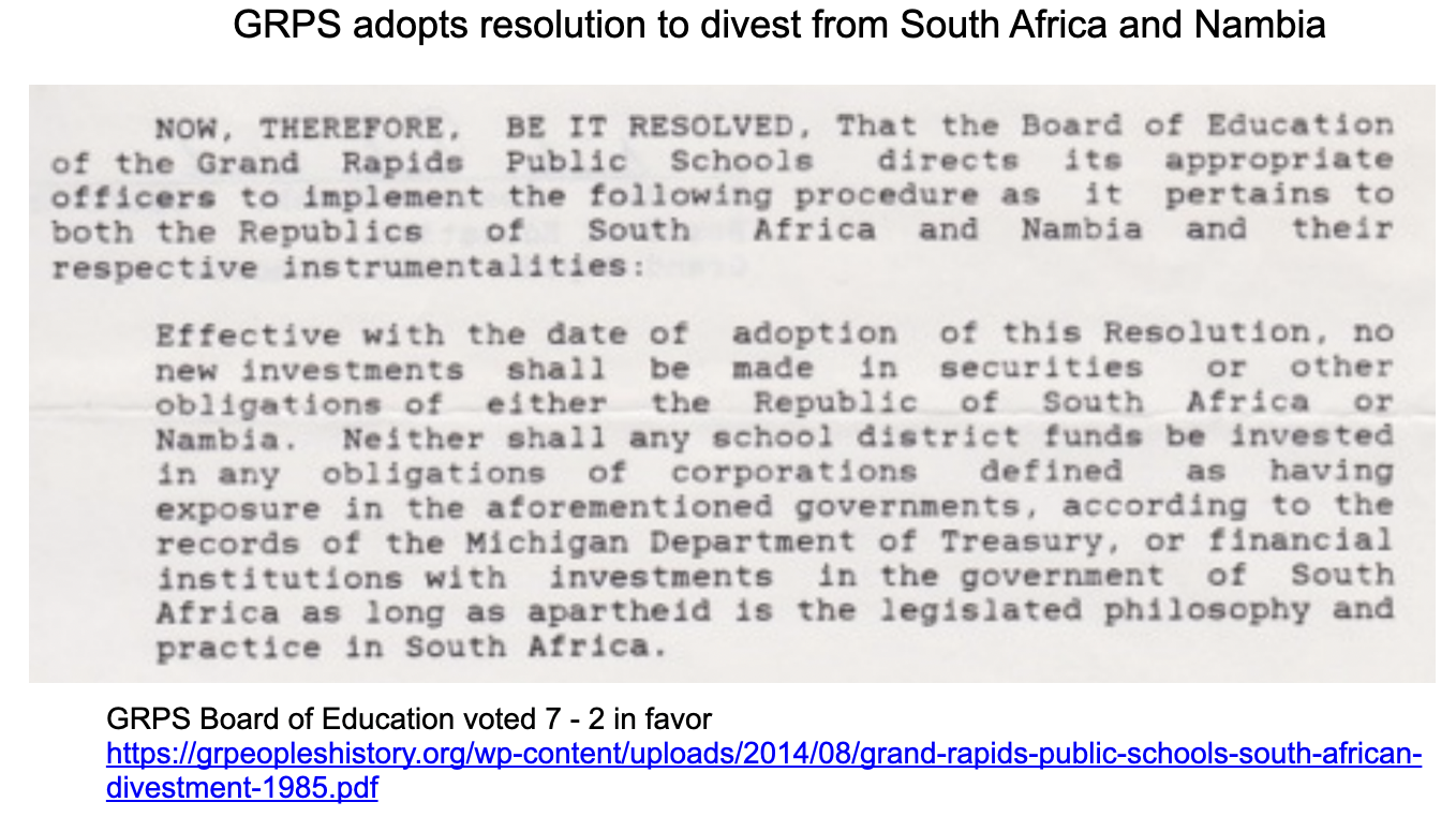 A final slide here below has information about a resolution that was passed by the GRPS Board of Education, which agreed to divest from South African in 1985. You can read about this campaign at this link.