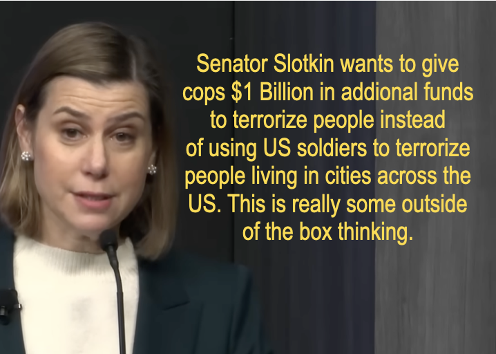 It is instructive to see that Senator Slotkin’s response to the Trump Administration’s deployment to cities like Los Angeles, D.C., Chicago and now to North Carolina, is to just increase the funding for police departments, which essentially act as occupying forces in urban communities. It’s also worth noting that Senator Slotkin has not denounced ICE in Chicago or other cities for kidnapping people and acting as an additional police force targeting immigrants.