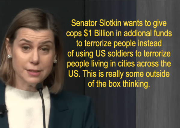 Senator Slotkin prefers to use cops as a tool of state carceral violence as opposed to the US military in US cities