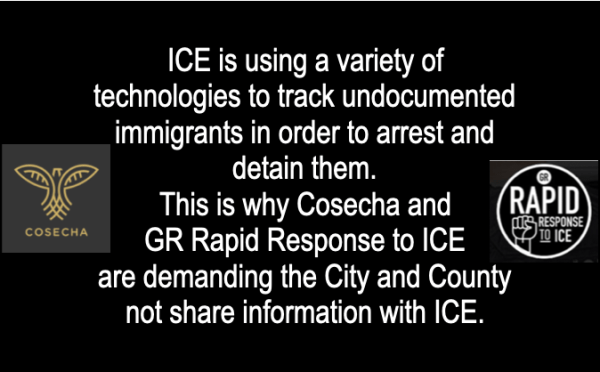 What Movimiento Cosecha and GR Rapid Response to ICE are demanding is that the City and the Kent County not share Flock camera images with ICE agents to track undocumented immigrants and to not allow City or County staff to ask people about their immigration status. These demands might seem insignificant, but for members of the affected community it is vitally important that they know that local governments are not sharing information with ICE about immigration status for those who live and work in the area, along with not sharing the Flock camera images with ICE under any circumstances.
