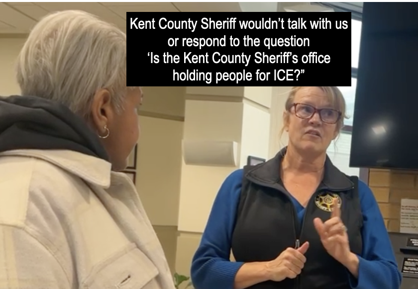 During the lunch hour, around 15 people with Movimiento Cosecha and GR Rapid Response to ICE entered the Kent County Sheriff’s office to engage in a disruption action, since these groups have learned that the Sheriff’s office is collaborating with ICE by putting holds on immigrants who have already been bonded out of the Kent County Jail.