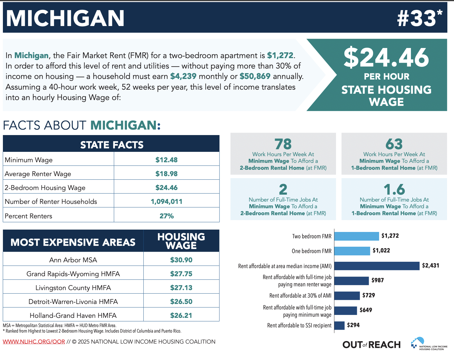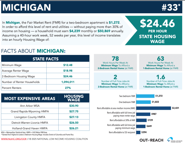 My third example is from Housing Next, which is a Grand Rapids Chamber of Commerce front group which has been pushing the expansion of housing for several years now. Housing Next even acknowledges the ridiculous rent costs in Grand Rapids, but their solution, which is a false solution, is “Zoning, financing, and public-private partnerships.” What Housing Next does not say and will not say is for people to be paid a living wage to everyone can afford the cost of housing in Grand Rapids. The National Low Income Housing Coalition says that in Grand Rapids, for a 2 bedroom apartment, people would have to make $27.75 an hour to afford the rent.
