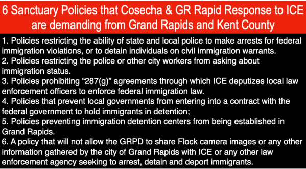 First, just because Chief Winstrom says so doesn’t mean it is true. Second, what Movimiento Cosecha and GR Rapid Response to ICE have been saying about the 6 sanctuary policy demands is for the city to adopt those 6 demands so that the demands will become policy, regardless of who is Mayor or is one of the 6 City Commissioners.
