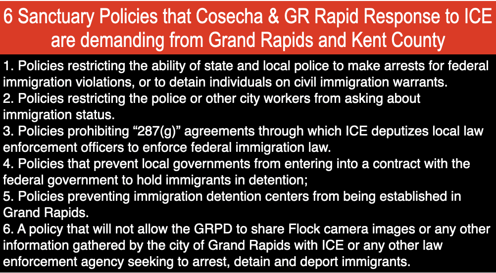 First, just because Chief Winstrom says so doesn’t mean it is true. Second, what Movimiento Cosecha and GR Rapid Response to ICE have been saying about the 6 sanctuary policy demands is for the city to adopt those 6 demands so that the demands will become policy, regardless of who is Mayor or is one of the 6 City Commissioners.