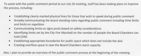 Third, in preparation for the July County Commission meeting, county officials wanted to make it clear that they were going to include some new protocols in response to the June 28 meeting, by dictating and controlling how public comment would go and how the physical space would be organized, as you can see from their comments here below.