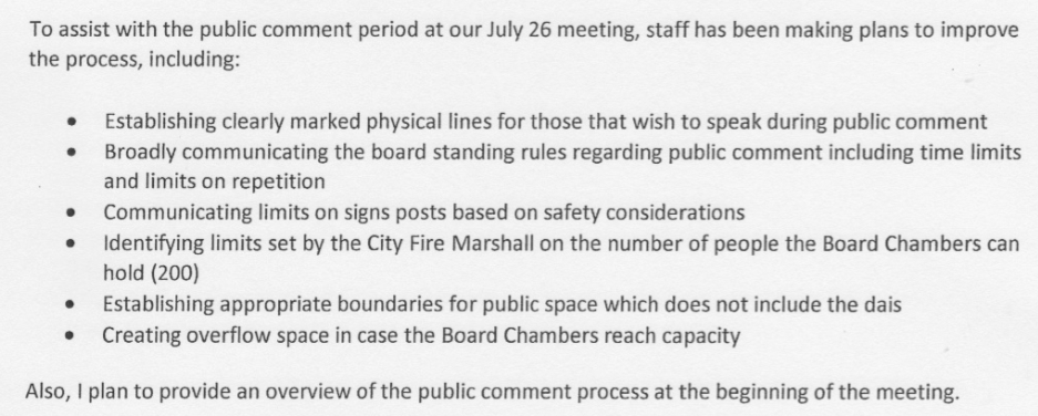 Third, in preparation for the July County Commission meeting, county officials wanted to make it clear that they were going to include some new protocols in response to the June 28 meeting, by dictating and controlling how public comment would go and how the physical space would be organized, as you can see from their comments here below.