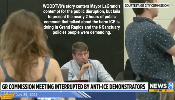 There were 14 times that I dissected how the local news reported on immigrations matters, with the majority of those stories having to do with how they reported on what Movimiento Cosecha and GR Rapid Response to ICE were doing to resist ICE repression. There were also several stories where I critiqued how the local news reported on what the Mayor of Grand Rapids or Police Chief Winstrom had to say about ICE. In each of these stories the local news took the Mayor and Chief Winstrom at their word. One example from WOODTV8 centers Mayor LaGrand’s comments during a City Commission meeting, despite the fact that for 2 hours during public comment people condemned ICE terrorism.
