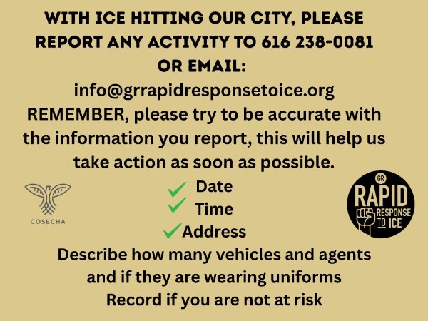 GR Rapid Response to ICE also responds to requests from community groups to do crowd safety for people who are afraid of ICE coming to community events for immigrant communities. Lastly, when ICE separates families, GR Rapid Response to ICE provides Mutual Aid for families, such as transportation, material support, legal counsel and raising money for families who have little or no income coming in. Since September GR Rapid Response to ICE has been able to raise just over $36,000 with every cent going directly to immigrant families.