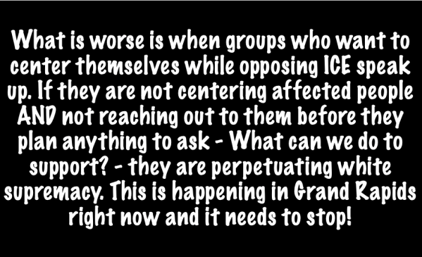 What is worse is when groups who want to center themselves while opposing ICE speak up. I they are not centering affected people AND not reaching out to them before they plan anything to ask – What can we do to support? – they are perpetuating white supremacy. This is happening in Grand Rapids right now and it needs to stop!