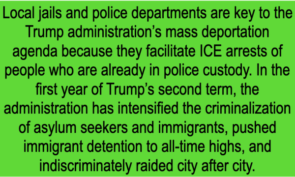 According to the Prison Policy Initiative local jails play a major role in the apprehension of immigrants for ICE, especially in states, counties and cities that have not adopted policies that would prevent local cooperation with ICE. See graphic above.