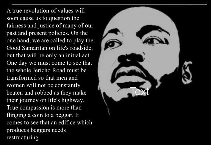 We have to understand the King who denounced what he called “the interrelated triple evils” of racism, economic injustice/poverty (capitalism) and war (militarism and imperialism, and who said that the “real issue to be faced” beyond “superficial” matters was “the radical reconstruction of society itself” – the King who argued that “only by structural change can current evils be eliminated, because the roots are in the system rather in man or faulty operations. For years I labored with the idea of reforming the existing institutions of the South, a little change here, a little change there. Now I feel quite differently. I think you’ve got to have a reconstruction of the entire society, a revolution of values.”