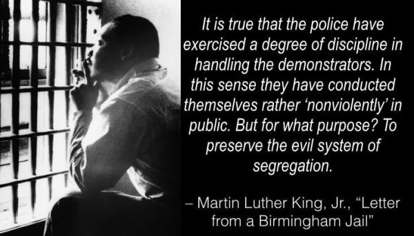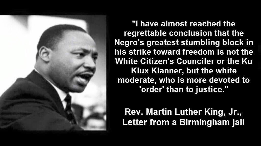 We have to embrace the Dr. King who in 1963 (“Letter From a Birmingham Jail”) wrote that the primary obstacle to overcoming American racial oppression wasn’t the open racism of segregation’s brutal enforcers but the tepid incrementalism of white moderates who counseled excessive patience and discouraged the mass direct action required to overthrow the Jim Crow regime.