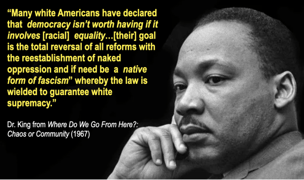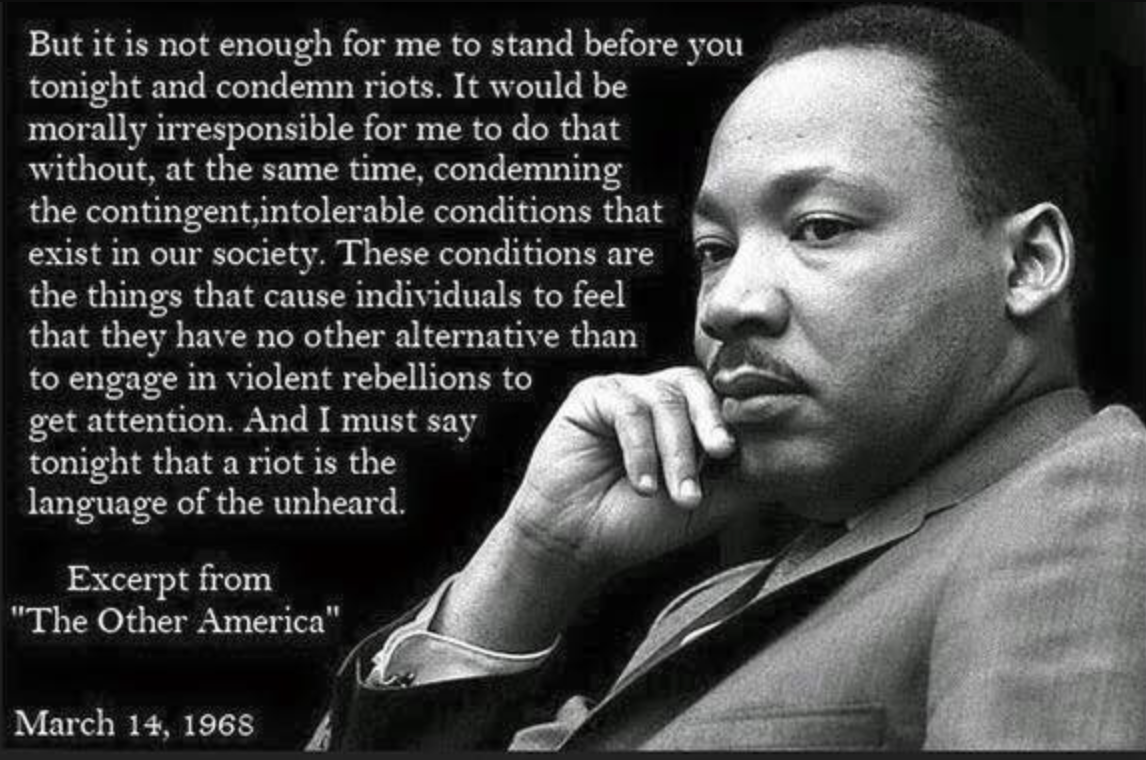 We have to embrace the Dr. King who placed the primary blame for the US race riots of 1965-67 on a “white power structure…seeking to keep the walls of segregation and inequality intact” and a “white society, unprepared and unwilling to accept radical structural change,” that told Black people “they must expect to remain permanently unequal and permanently poor.”