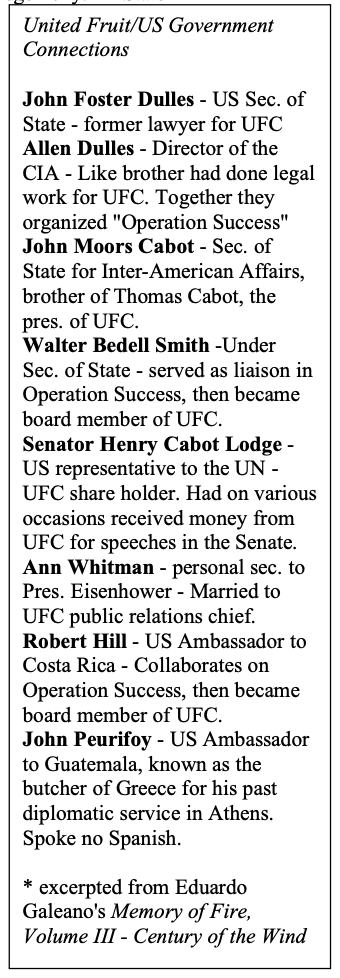 However, the United Fruit Company was not going to let the Guatemalan government to use land for the betterment of its own people. There were numerous people in the Eisenhower Administration that had a long history with the United Fruit Company, so they devised a plan to use the CIA to overthrow the government and did so in the summer of 1954. The CIA installed a Colonel named Castillio Armas that was willing to be a puppet for the US government and US interests.