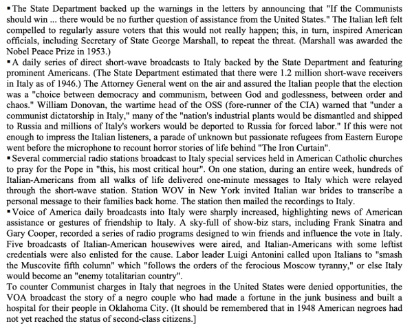 With Italy there were several political parties like the Popular Democratic Front (PDF) that included those who embraced both socialist and communist beliefs. The US feared that Italy would have a socialist/communist government after the elections, so they invested a great deal of money, propaganda and other tactics to prevent the PDF from winning. Here is a short sample of some of the tactics that the US government used: