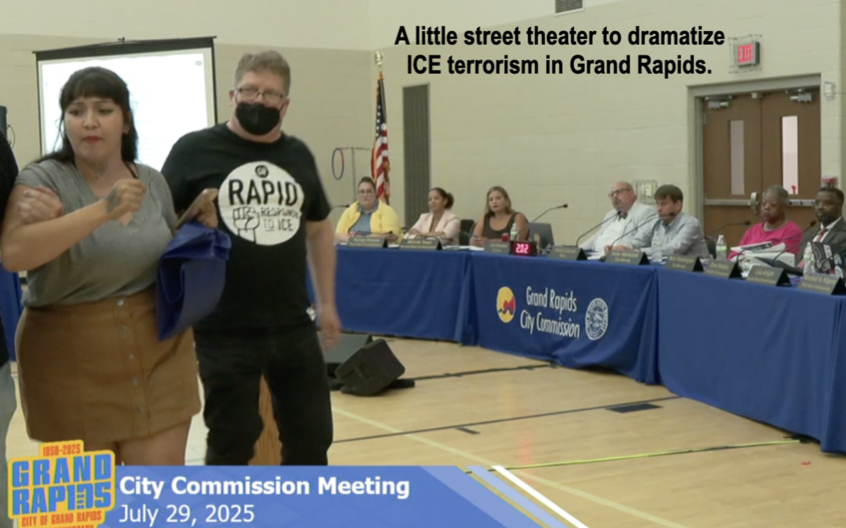 Towards the end of the City Commission meeting (1:40:00 into the video), Mayor LaGrand said that none of us can outsource democracy, meaning we all have an obligation to practice democracy. This is insulting to lots of people in the city who are dedicated and committed practitioners of democratic principals. As someone who has been involved in GR Rapid Response to ICE since 2017, I have seen hundreds of people do the work to try to prevent ICE from taking immigrants, people accompanying immigrants to appointments when they don’t feel safe in public, doing patrols in neighborhoods where ICE has been sighted, providing transportation, food, diapers and funds so that immigrant families can survive after a loved one has been arrested, set to a detention center and often deported. People do this work are not relying on the government or any other institution to do it, because they are doing it and not just talking about it.