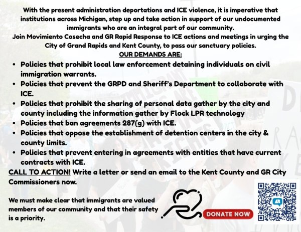 Of course, if you want to become involved in the campaigns to get the City of Grand Rapids and Kent County to adopt the 6 sanctuary policies, contact Cosecha and GR Rapid Response to ICE.