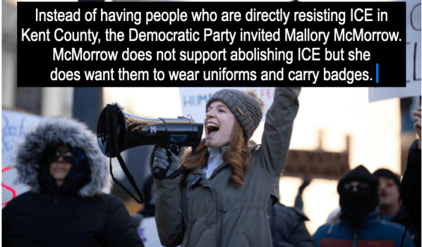 Instead, the Kent Dems invited the Senate candidate Mallory McMorrow to speak. McMorrow has NO history of demanding that ICE be abolished and her stance on ICE and immigration includes the following: