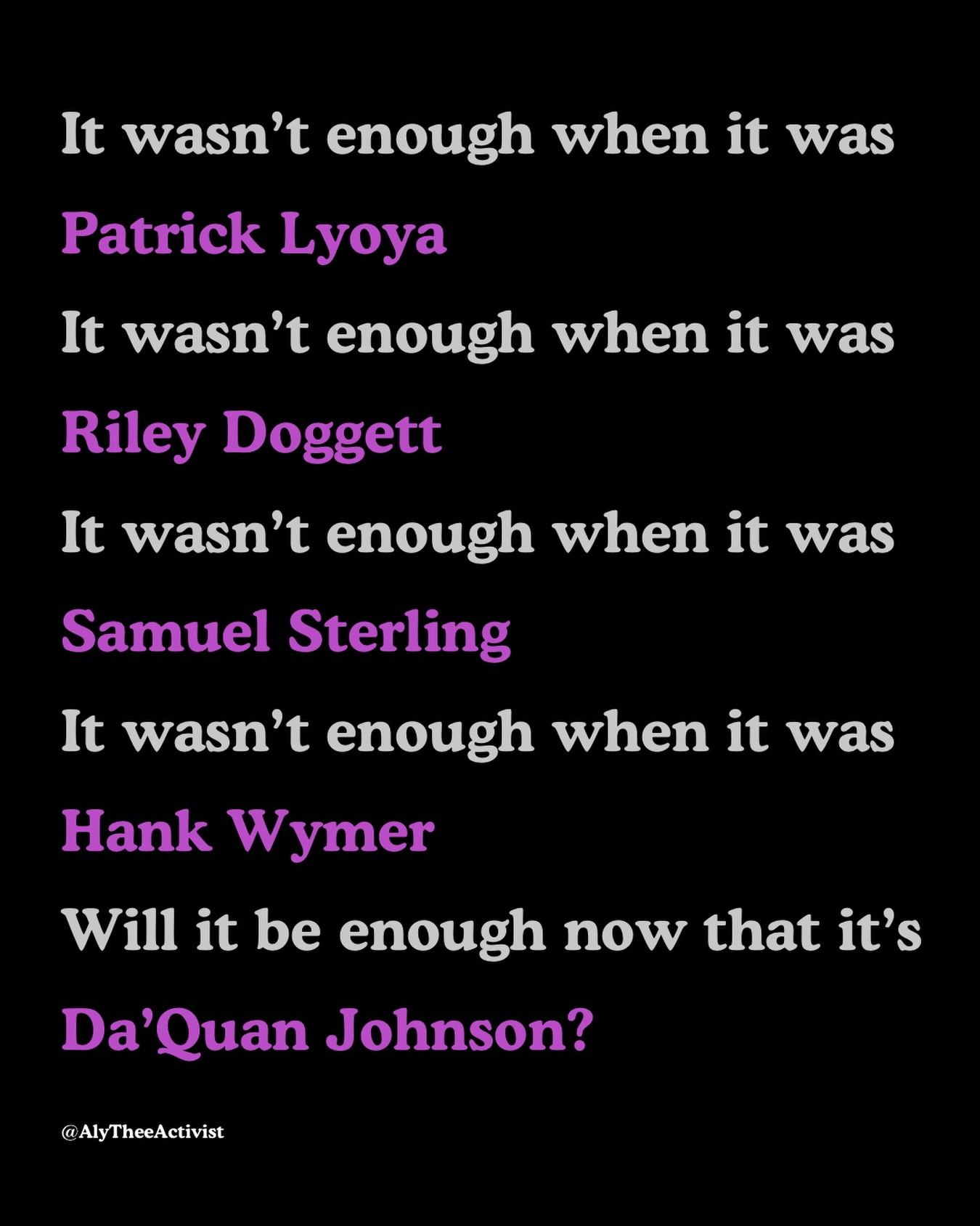 We do need to see that policing is a systemic and structural issue that has been designed to used force to criminalize Black and Brown communities and to suppress any form of public dissent. This system cannot be reformed, it must be abolished. How we do this work is not for public consumption, but it will require deep commitment and sacrifice. Justice for Da’Quain Johnson!