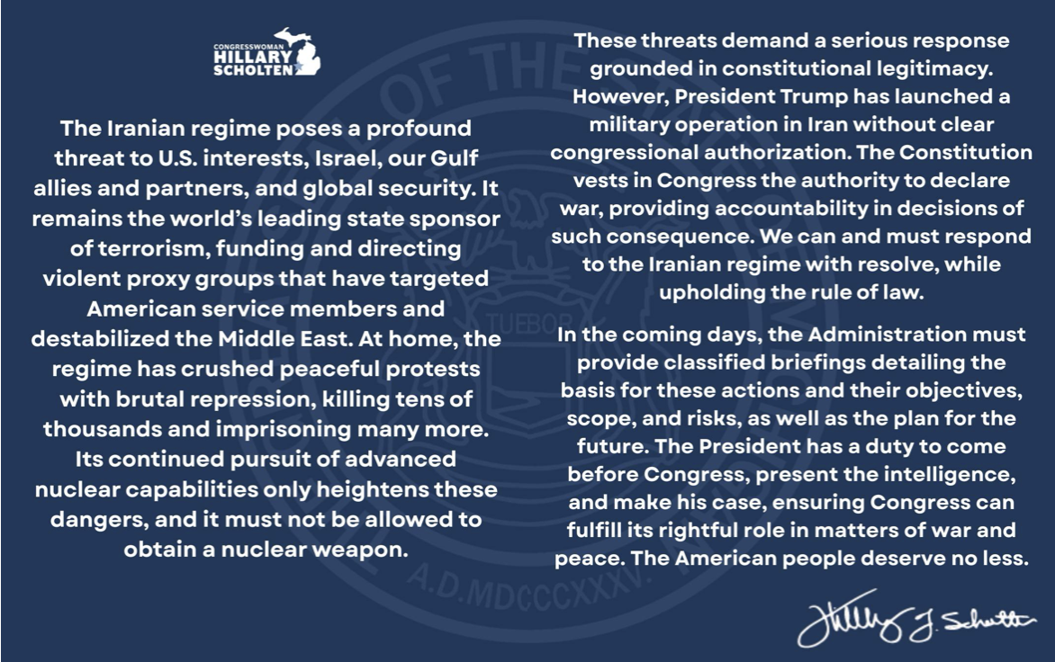 Michigan’s Rep. Scholten and Senator Slotkin both release statements condemning Iran as the US attacks that country