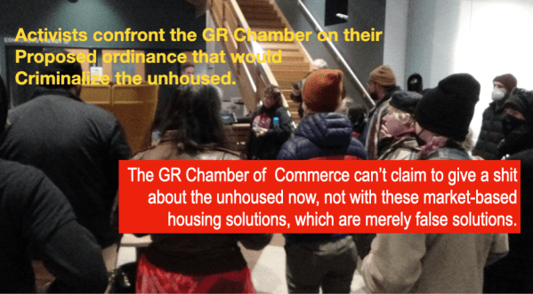 In fact, the government affairs staff member at the GR Chamber of Commerce, Josh Lunger, was calling for an increase in GRPD cops, since unhoused people were a threat to the safety and commerce of the people and businesses in downtown Grand Rapids.