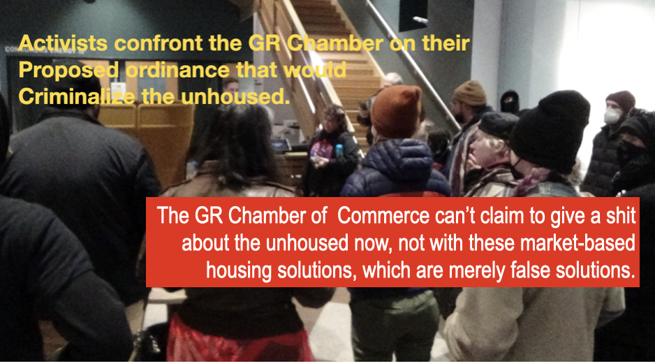 In fact, the government affairs staff member at the GR Chamber of Commerce, Josh Lunger, was calling for an increase in GRPD cops, since unhoused people were a threat to the safety and commerce of the people and businesses in downtown Grand Rapids.