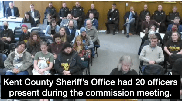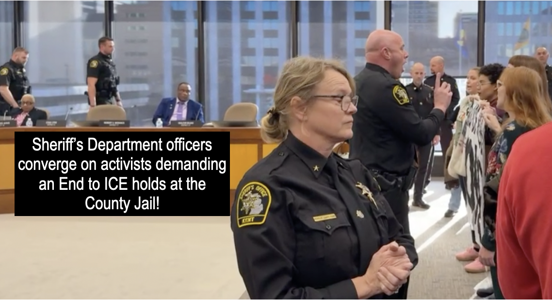 An estimated 20 officers with the Kent County Sheriff’s Department were called upon by the Chair of the Kent County Commission – Ben Greene – to remove people from the commission chambers. The four activists who were holding a banner with the words – End ICE Holds NOW – were arrested and taken into one of the conference rooms in the County Building.