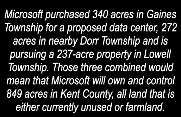 The article also includes lots of data and several graphics on data centers and water use, but there are two important things that are omitted from this article. First, while the article acknowledges that the more recent proposed data center projects will be much larger that other existing ones on Michigan, there is no real conversation or analysis about land use. For instance, Microsoft purchased 340 acres in Gaines Township for a proposed data center, 272 acres in nearby Dorr Township and is pursuing a 237-acre property in Lowell Township. Those three combined would mean that Microsoft will own and control 849 acres in Kent County, all land that is either currently unused or farmland.