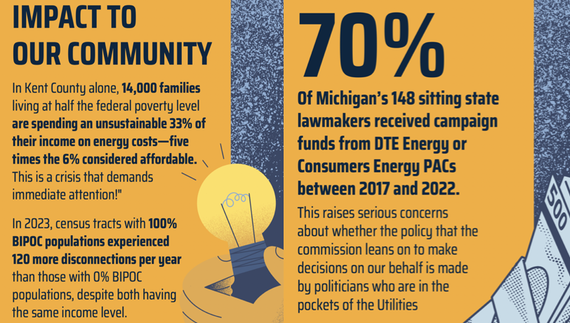 “Besides the less than transparent regulatory process, there are also concerns surrounding reliability and disproportionate disconnection rates tied to race. Consumers Energy ranks among the lowest performers nationwide when it comes to reliability, but most alarming are the systematic disconnections disproportionately targeting BIPOC communities. In his rebuttal testimony to the Michigan Public Service Commission, Boratha Tan on behalf of the Ecology Center, The Environmental Law & Policy Center, The Union of Concerned Scientists and Vote Solar, found a direct correlation between the percentage of people of color living in a census-tract and disconnections by Consumers Energy, even when the area median income was the same. In 2023 “census tracts with a 100% BIPOC population would experience about 120 more residential disconnections compared to a 0% BIPOC population census tract with the same income level.” In other words (using Consumers Energy’s own data), disconnections happen more often in BIPOC communities than in non-BIPOC communities, even when both communities have the same income level.”