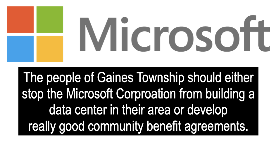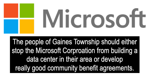 The notion of CBAs, as presented by Power Shift Action, is fundamentally different than the “commitments” that the Microsoft Corporation is offering to Gaines Township. Now, the Crain’s article doesn’t elaborate on whether the Gaines Township government, the residents of Gains Township or the Microsoft Corporation initiated these “commitments”, but my money would be on the Microsoft Corporation, or at best a collaboration between Gaines Township and the global tech company.
