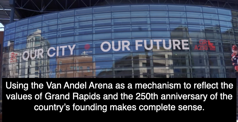 Therefore, using the Van Andel Arena as a platform to celebrate values of the city and the 250th anniversary of the founding is in one sense rather offensive, since the history of the Van Andel Arena is rather undemocratic and has been an asset that has made the DeVos and Van Andel families lots of money. At the same time one could argue that the Van Andel Arena does reflect the values of the city and the 250th anniversary of the founding of the US, since it is rooted in displacing people, exploiting people and generating significant wealth for a few members of the Capitalist Class. Yeah, that sounds like the values of Grand Rapids and good old USA.