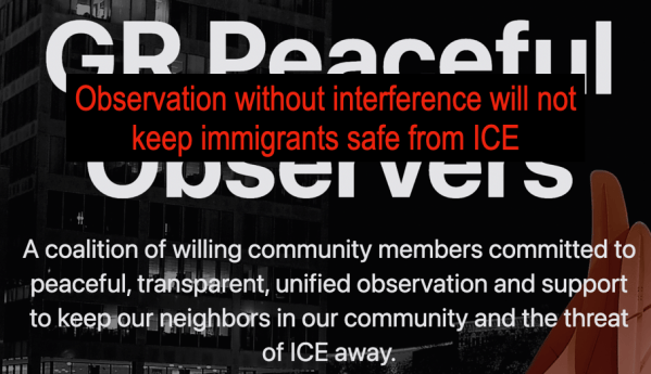 We, as GR Peaceful Observers, form a coalition of willing community members committed to peaceful, transparent, unified observation and support to keep our neighbors in our community and the threat of ICE away. Again, merely observing will not keep immigrants safe from ICE.