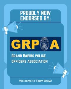 The continued pro-police support for Drew Robbins is now reflected in the fact that he is being endorsed by the Grand Rapids Police Officer’s Association. Robbins posted this announcement on his Facebook page on April 11, plus he included the following narrative: