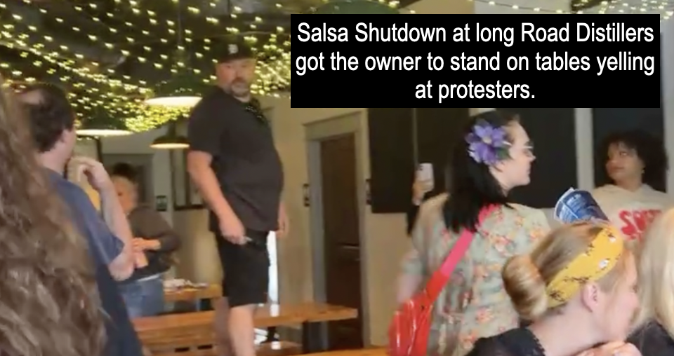 About 25 people entered the Long Road Distillers on Friday and began dancing to salsa music as a tactic to disrupt business as usual at the restaurant/bar. In addition, one of the Cosecha organizers was talking about why there was a boycott, about the sanctuary policies and the realities for immigrants living in constant fear of ICE.