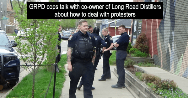 All of the people who were part of the salsa shutdown then left the building, but continued to dance and chant outside on the sidewalk. Jon O’Connor, who was flanked by the GRPD cops stated that if be ever came back they would be arrested for trespassing. Those protesting ignored O’Connor and continued to dance and chant for another 5 – 7 minutes.