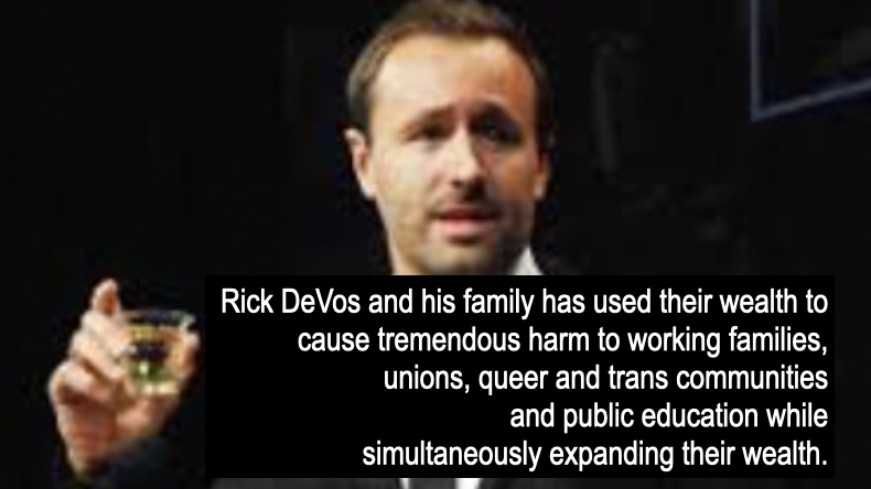 - Adopting economic policies that have made it hard for working class families to survive in the system of Capitalism that Rick DeVos and his family has made billions off of.