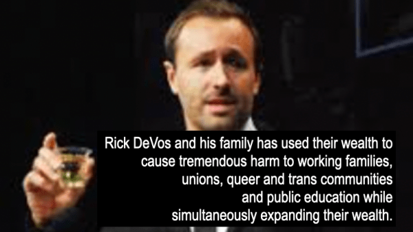 Rick DeVos and his family also hides hundreds of millions of dollars from being taxed in their foundations and then re-directs that money to far right think tanks, the religious right and to other entities that support their ideological stance on numerous issues. You can read about all of this in 830 pages of the DeVos Family Reader.